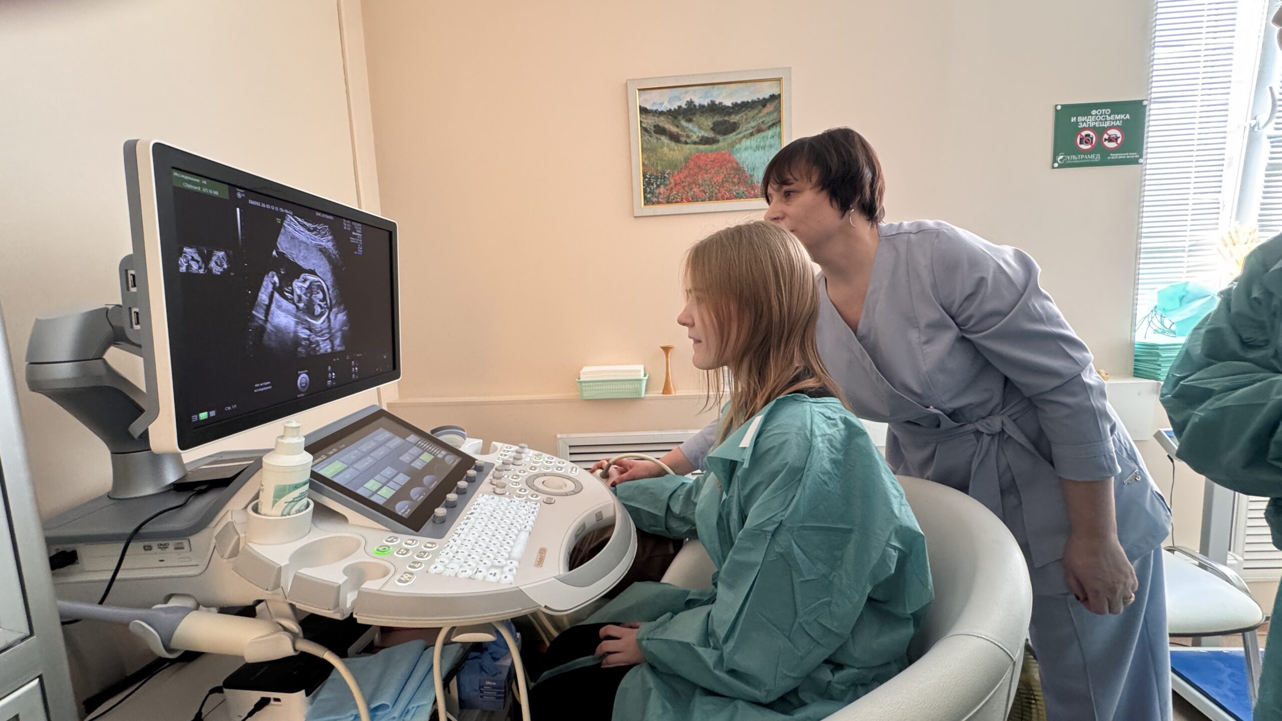 Самым ярким и неожиданным моментом экскурсии стал практический мастер-класс врача ультразвуковой диагностики Полонской Юлии Анатольевны. Для школьников был проведён показательный приём с участием беременной пациентки.